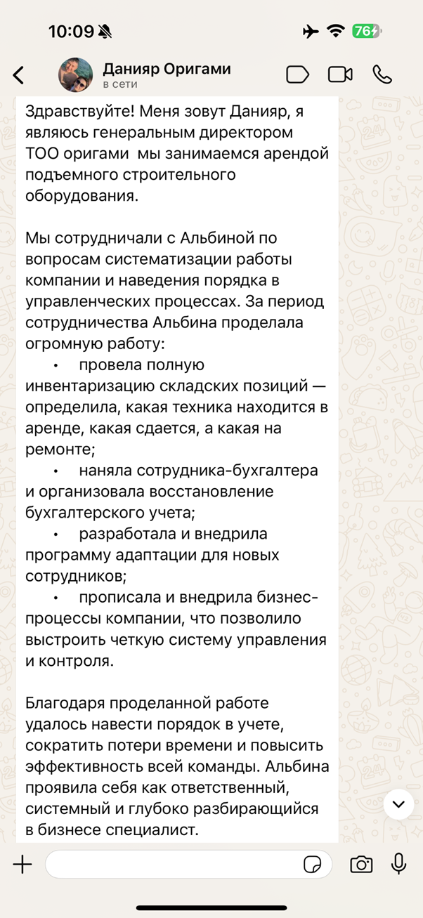 Мне нет смысла строить отдел продаж ради «галочки». Я знаю: если система не будет работать и сделки не пойдут, клиент уйдёт. Поэтому у меня всегда высокая мотивация довести отдел продаж до реального результата с первого месяца.